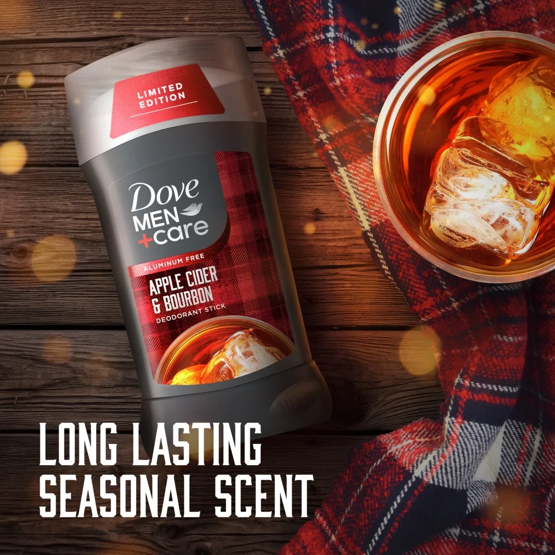 Dove Men+Care Deodorant Apple Cider & Bourbon 3 oz Stick formula is aluminum free. This deodorant stick is part of our Limited-Edition Holiday Classic collection, inspired by indulgent seasonal fragrances. In the heart of a fall orchard, this scent will draw you into a world of opulent flavors and aromas. Our deodorant stick gives you powerful 72h odor protection whilst caring for your skin. This Dove aluminum free deodorant for men is formulated with one fourth moisturizing cream to help retain skin moisture and protect against irritation. It's all the comfort, odor protection and underarm skin care you need in one powerful deodorant stick. For adult use.