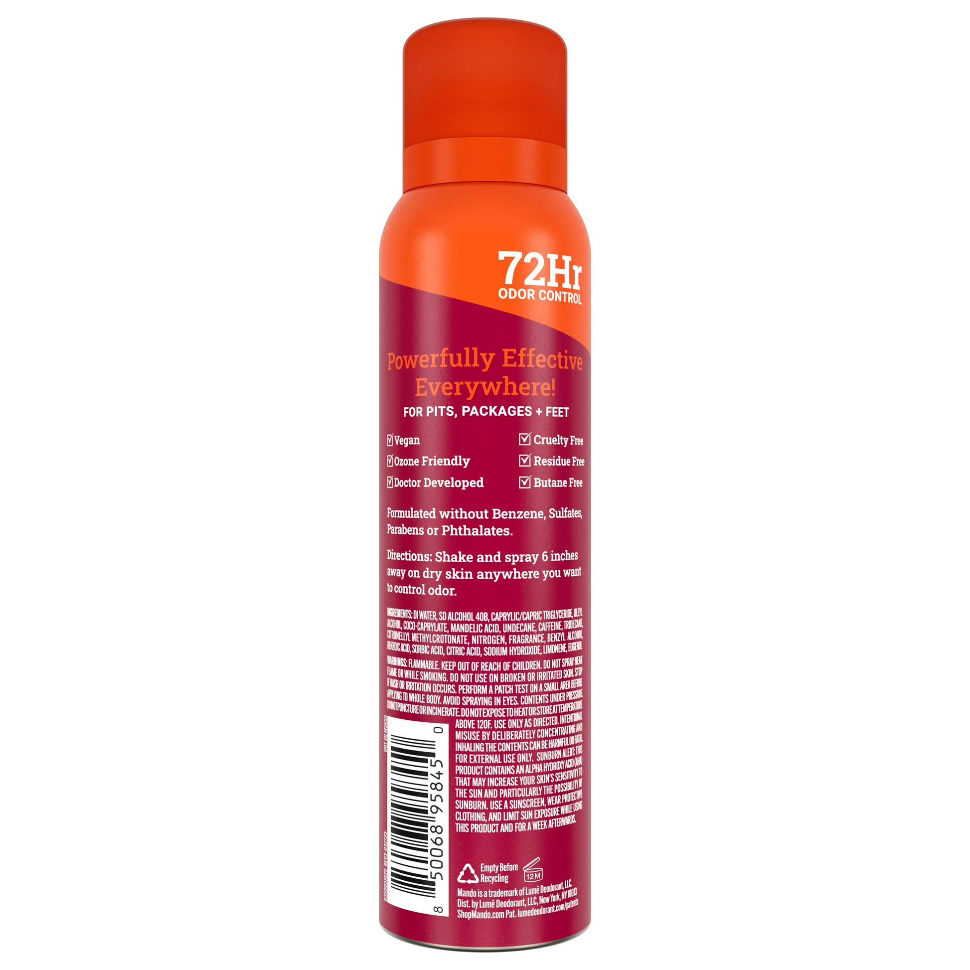 Body odor isn't just a pit problem—it's an everywhere problem. That's why Mando Whole Body Deodorant was designed to tackle odor head-on, from pits to feet and beyond. Mando is doctor-developed and backed by science. Formulated with a gentle alpha-hydroxy acid, Mando targets odor-causing bacteria at the source, keeping your skin's pH balanced to prevent odor before it starts. Our Clinically Proven Invisible Spray Deodorant protects against odor for up to 72 hours. Just point, spray, and enjoy powerful all-over protection."