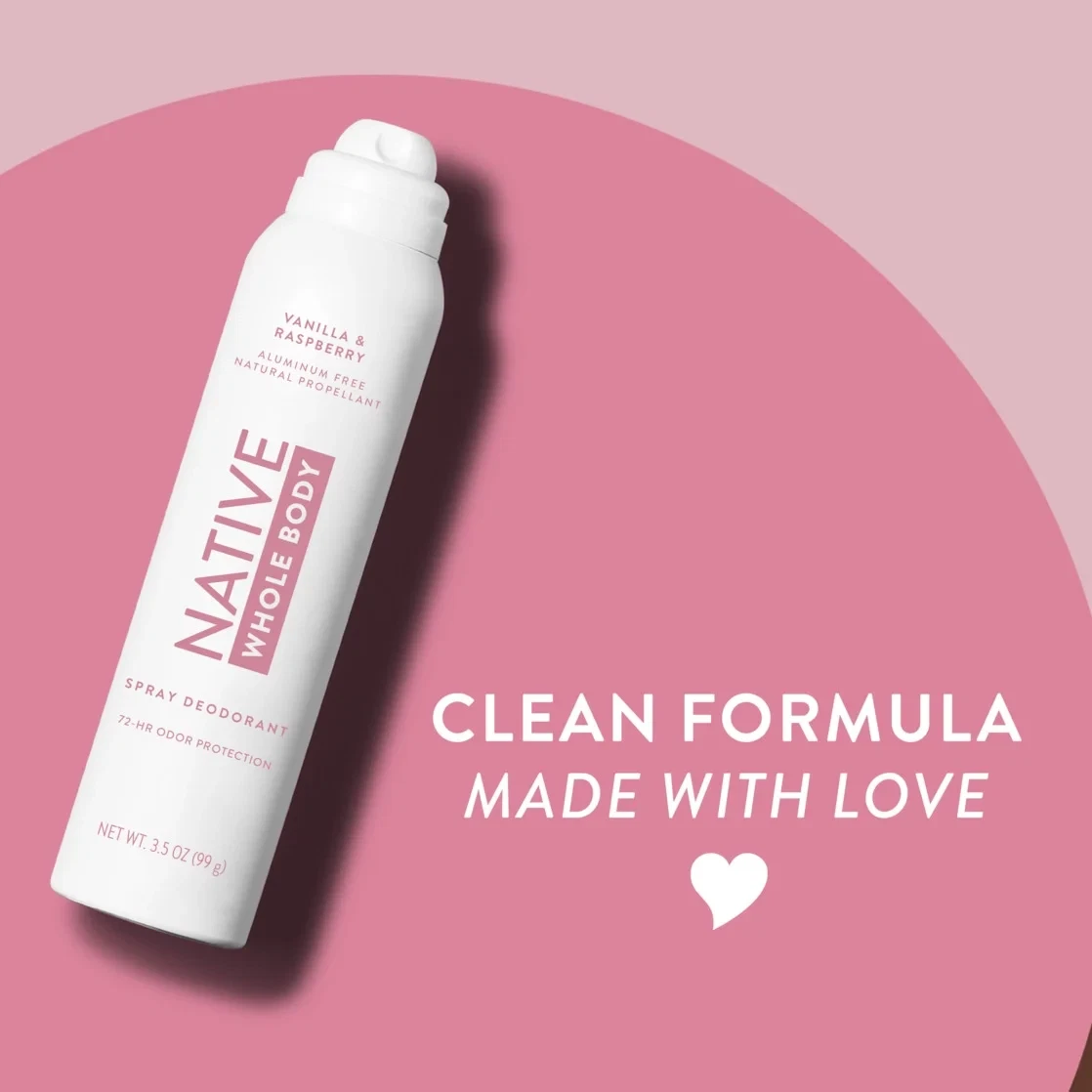 Native Deodorant, Aluminum Free, Sensitive Whole-Body Spray Deodorant Vanilla & Raspberry Scent 3.5 oz