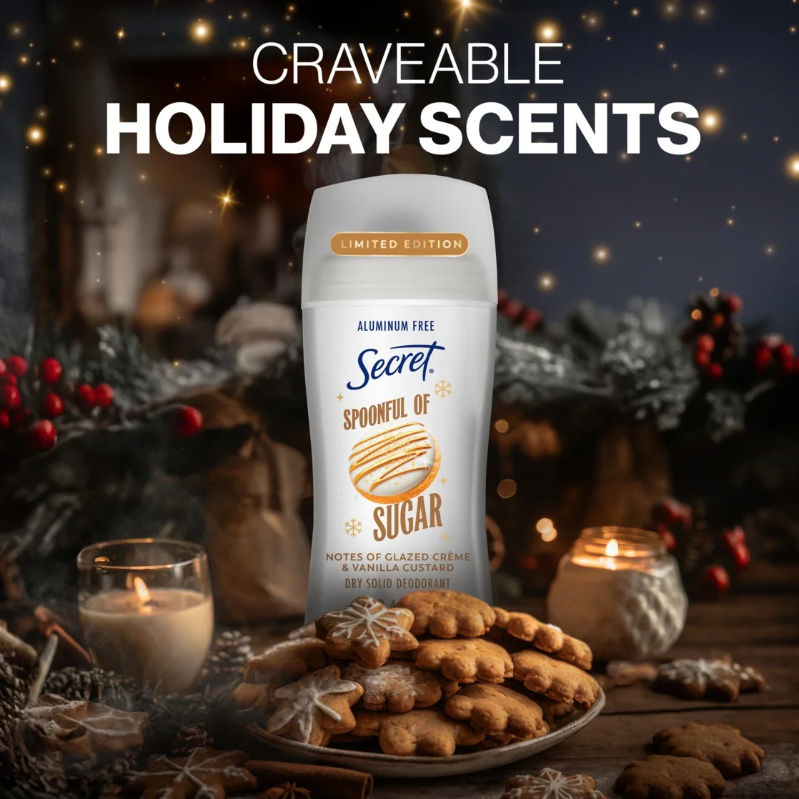 Secret Holiday Aluminum Free Deodorant for Women provides up to 48 hours of odor protection that is Aluminum free, and smells like warm Sugar Cookies. It's also free of parabens, dyes, talc and baking soda. The new dry stick formula is certified cruelty-free by PETA and has been designed to be gentle while providing premium odor protection. Made with the #1 dermatologist recommended moisturizing ingredient and 3x more odor fighters, Secret Aluminum Free Deodorant for Women goes on smooth and works all day to help keep you feeling fresh, confident, and odor-free- all throughout the holidays and beyond.