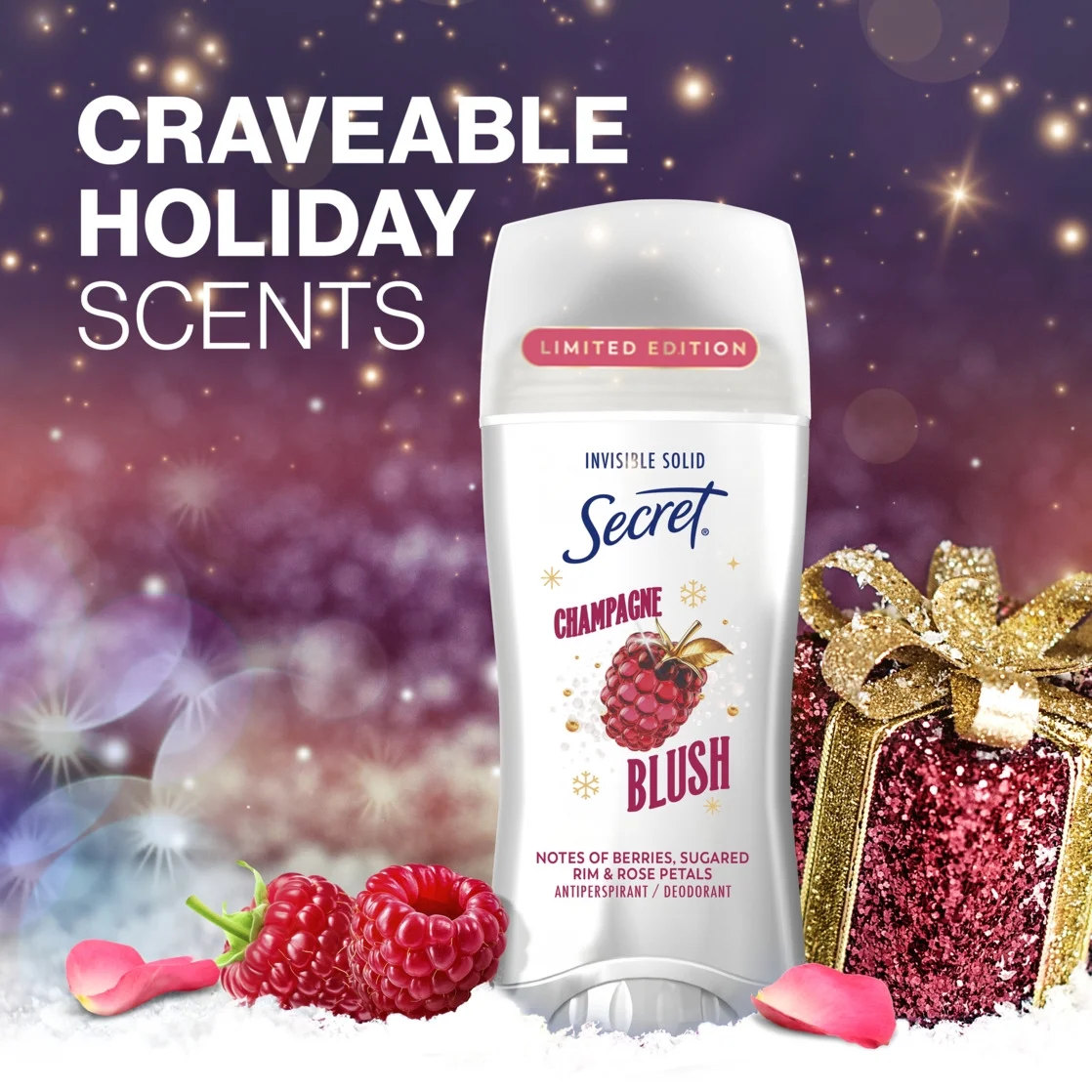 The Secret Fresh Holiday Collection features long-lasting scents designed to keep you feeling fresh. The Secret Antiperspirant and Deodorant for Women in Fresh Invisible Solid offers instant odor protection and 72-hour breathable sweat control, ensuring you stay confident throughout the day- all while smelling like Sparkling Fruity Freshness. It goes on smoothly, and delivers a refreshing burst of scent that lasts. Additionally, it includes pH Balancing Minerals for optimal freshness. Perfect for daily use, this product helps you maintain a clean and confident feeling from morning until night, all throughout the holidays and beyond.